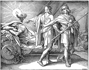 『あなたは、この日、自分の目で、主があなたをきょう、ほら穴の中でわたしの手に渡されたのをごらんになりました。人々はわたしにあなたを殺すことを勧めたのですが、わたしは殺しませんでした。『わが君は主が油を注がれた方であるから、これに敵して手をのべることはしない』とわたしは言いました。サムエル記上24:10』